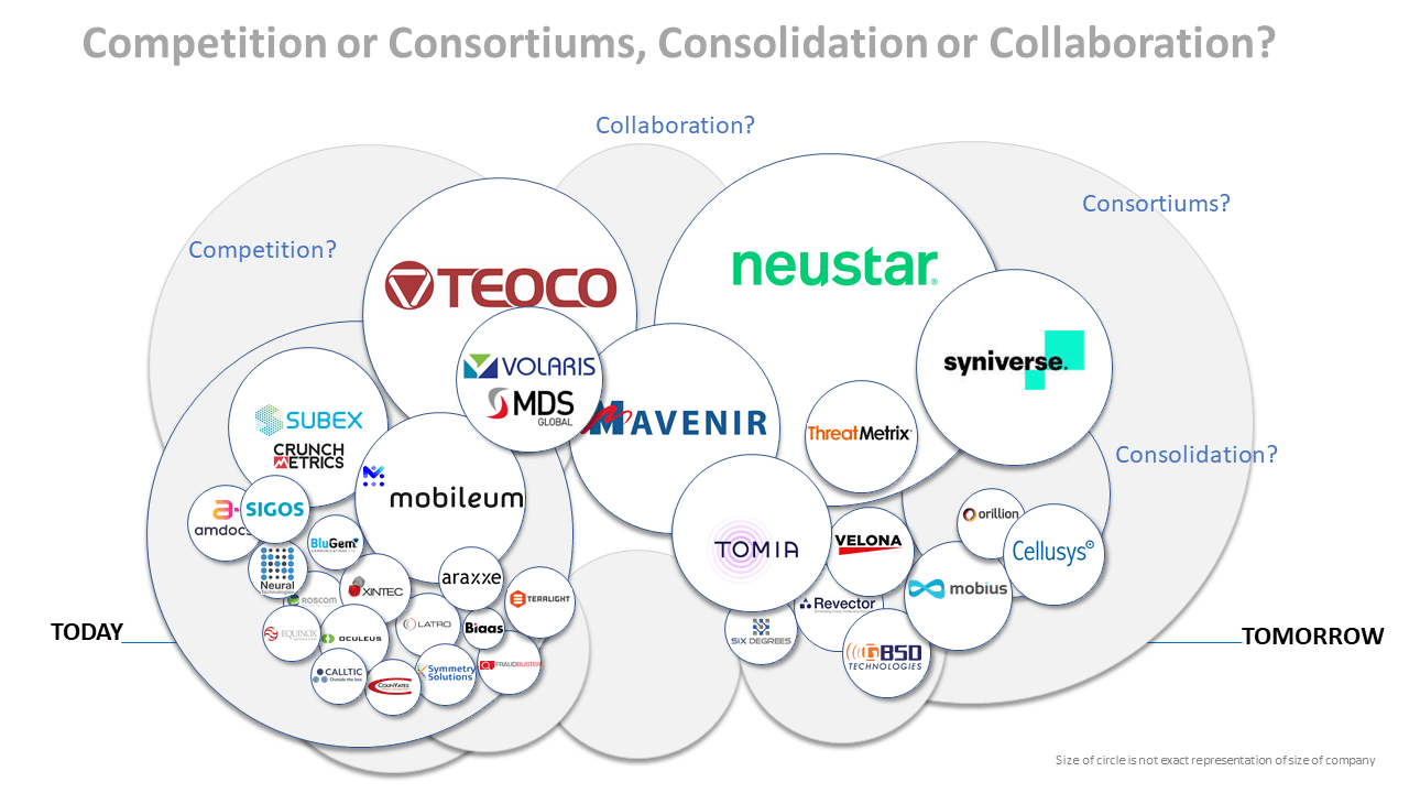 Please note: the following has been collated from memory and of course some 'Google' searching. The size of the circles does not represent accurately the size of the businesses. Not every fraud management vendor or revenue assurance vendor maybe shown on the diagrams, these are memories and experiences of the author and no vendor has intentionally been overlooked.
